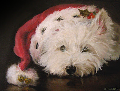 Who can resist this darling little face waiting so patiently for Santa to arrive? Decked out in an old fashioned Santa cap of soft red velvet, trimmed in fur, bells and holly, this adorable Westie pup awaits the arrival of Santa Claus! To purchase email jeanneillenye@sbcglobal.net